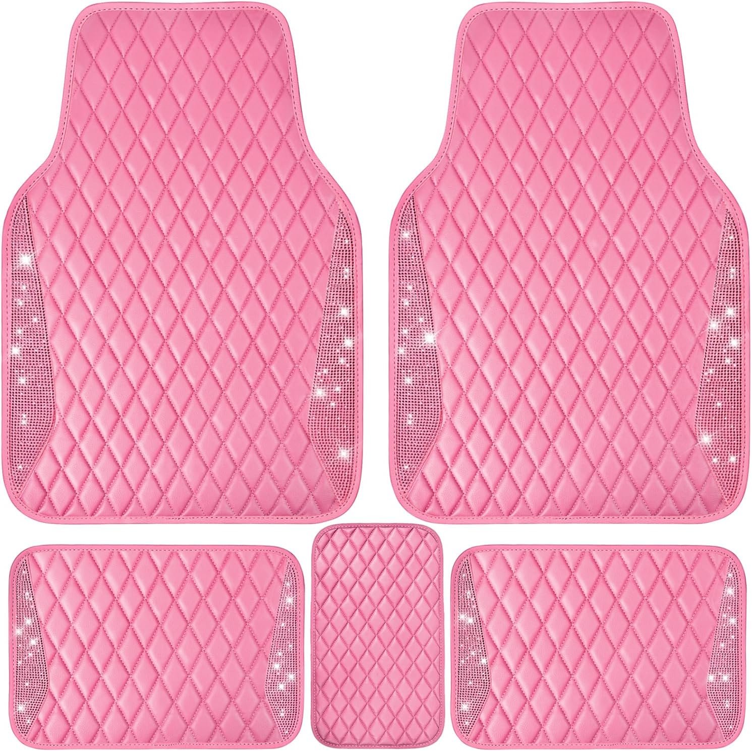 Leather Car Mats Shining Diamond Floor Mats Crystal Rhinestones Sparkly Glitter Carpet Anti-Slip Waterproof Pad Universal Fit for Automotive SUV, Sedan, Van, 5pcs for Girl Women Pink