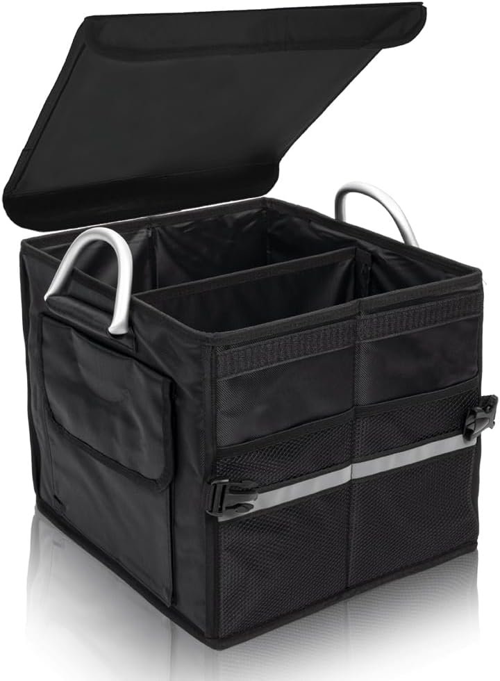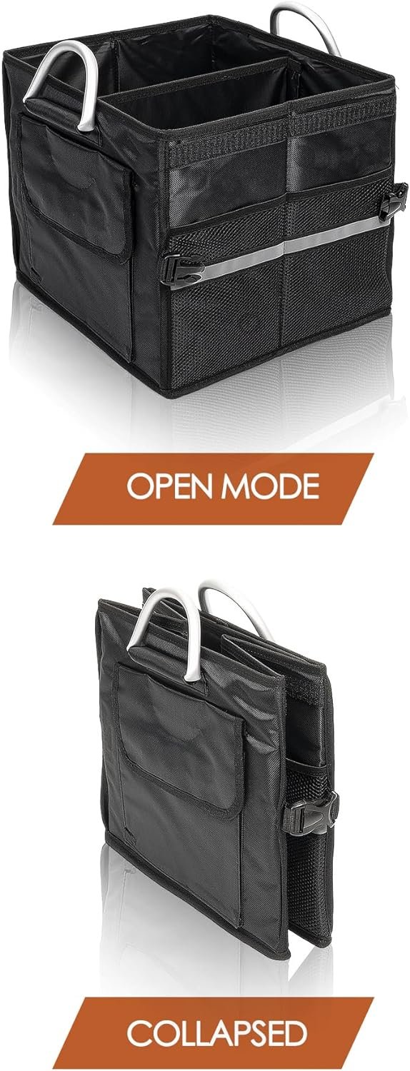 - 4.Vehicle Trunk Storage Box Size: Fully expanded size is 22.4″( length) x 13.1″(width) x 11.4″( height), with 4 compartments for classified organization
